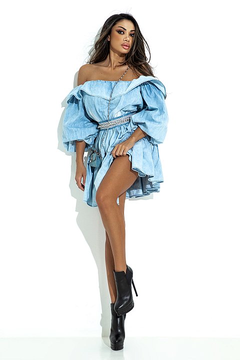 Abito lungo fino alle spalle con maniche a sbuffo e balza al fondo. In vita è accessoriato con cintura a catena staccabile e jeans che faranno risaltare la tua figura.