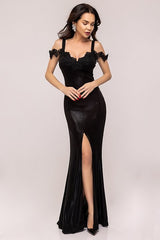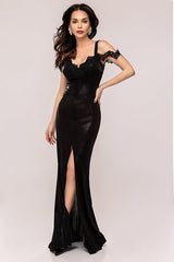 Elegante Abito Lungo in Velluto Nero con Spacco e Dettagli in Pizzo