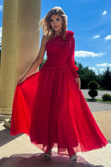 Un elegante abito da sera monospalla in chiffon rosso vivace, caratterizzato da una gonna lunga e fluente che conferisce un movimento etereo. Il dettaglio floreale sulla spalla aggiunge un tocco di raffinatezza, rendendolo perfetto per eventi formali o cerimonie. Ideale per chi vuole fare un'entrata in grande stile.