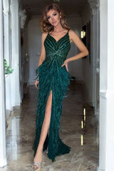 Raffinato abito da sera verde, impreziosito da piume leggere e scintillanti perline. Il design elegante valorizza la figura con un taglio sofisticato e una scollatura discreta, perfetta per esaltare la femminilità con classe. Il lungo spacco laterale dona un tocco sensuale, rendendo questo capo ideale per serate di gala o eventi speciali. Un abito esclusivo che combina stile e charme senza tempo.