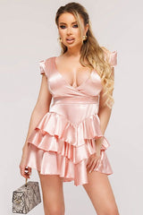 Scopri il fascino irresistibile di questo mini abito rosa in tessuto satinato, perfetto per brillare in ogni occasione speciale. Il profondo scollo a V valorizza il décolleté, mentre la gonna con strati di volant aggiunge volume e movimento per un look ultra femminile. Le spalline strutturate completano il design raffinato, rendendolo ideale per feste, appuntamenti o eventi importanti. Abbinalo a tacchi alti e clutch preziose per un outfit da vera protagonista.