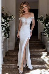 Lasciati conquistare da questo abito lungo bianco, perfetto per cerimonie ed eventi esclusivi. Il corpetto con scollo a cuore e dettagli in pizzo ricamato valorizza il décolleté, mentre le maniche off-shoulder aggiungono un tocco romantico. Il taglio a sirena con spacco frontale slancia la silhouette, rendendolo ideale per matrimoni, gala o occasioni speciali. Indossalo con sandali nude o argento e un'acconciatura raccolta per un look da sogno.