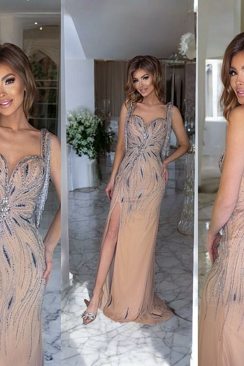 Un capolavoro di eleganza, questo abito lungo nude è impreziosito da ricami di strass e cristalli disposti in un raffinato motivo ondulato. Il corpetto strutturato con scollo a cuore valorizza il décolleté, mentre le frange brillanti sulle spalline donano movimento e luce. Lo spacco laterale aggiunge un tocco sensuale mantenendo classe e raffinatezza. Perfetto per cerimonie da sogno, red carpet o serate indimenticabili.