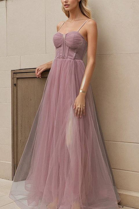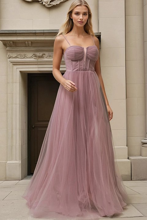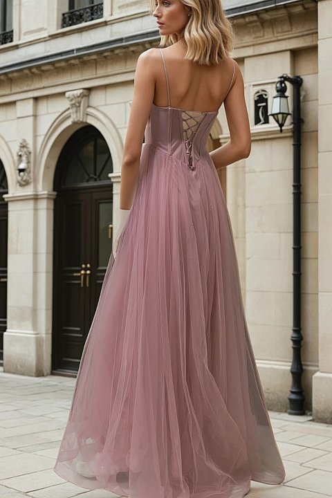 Questo raffinato abito lungo in tulle rosa cipria è la scelta ideale per un look da sogno. Il corpetto strutturato con stecche e scollo a cuore esalta la silhouette con un tocco di sensualità, mentre la gonna in tulle leggero dona movimento e grazia. Le spalline sottili completano il design sofisticato, rendendolo perfetto per matrimoni, eventi formali e serate eleganti. Abbinalo a sandali con tacco e accessori luminosi per un outfit da vera principessa moderna.