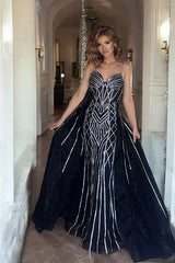 Il Black Crystal Mermaid Gown è un abito da sera dal fascino scenografico e senza tempo. Realizzato in tessuto nero con decorazioni a strass che disegnano linee geometriche brillanti, presenta una silhouette a sirena con scollatura a cuore e spalline sottili. Lo strascico in tulle glitterato dona movimento ed eleganza ad ogni passo. Ideale per gala, cerimonie di lusso o serate formali dove vuoi lasciare il segno. Un vero gioiello da red carpet.