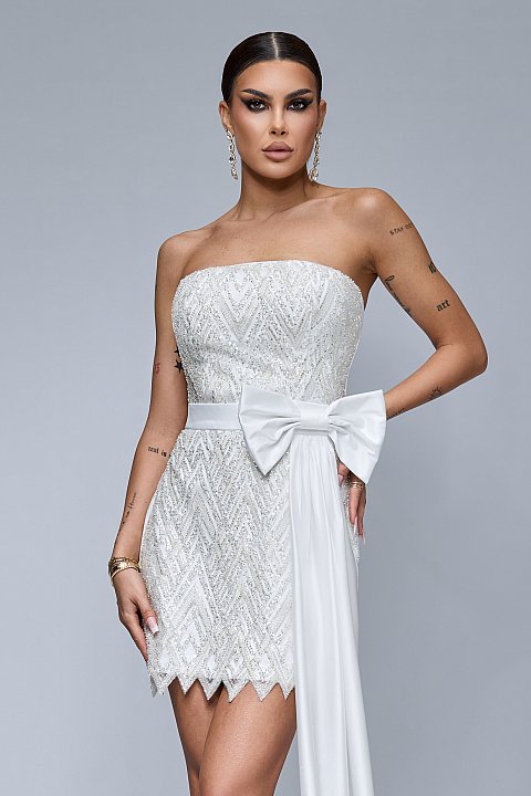 Abito corto elegante senza spalline, con paillettes, orlo a zig zag e dettaglio fiocco con strascico laterale.