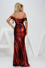 Abito rosso lungo paillettato con spacco, striature nere, spalline laterali, corsetto effetto push up e chiusura posteriore con zip nera.