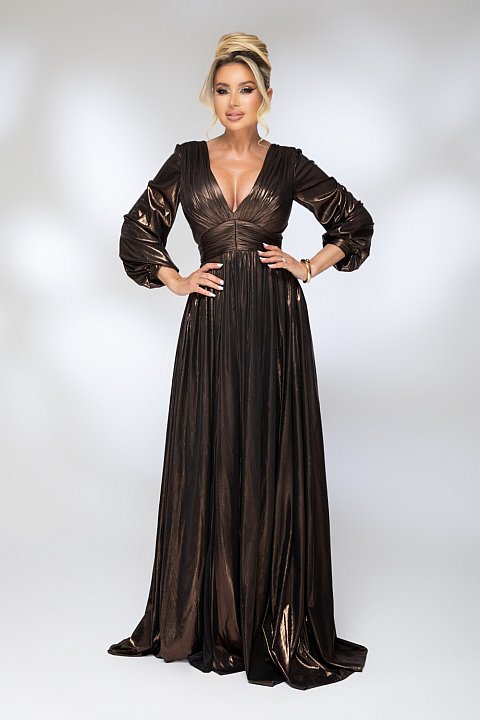 Abito lungo marrone metalizzato. Realizzato in tessuto scintillante, questo abito cattura la luce per un effetto mozzafiato. La scollatura profonda a V aggiunge un tocco sensuale, mentre le maniche lunghe e ampie donano un look sofisticato e chic. La vita stretta esalta la figura, con una gonna fluida e ampia che termina con uno spacco laterale, perfetto per un look glamour e seducente.