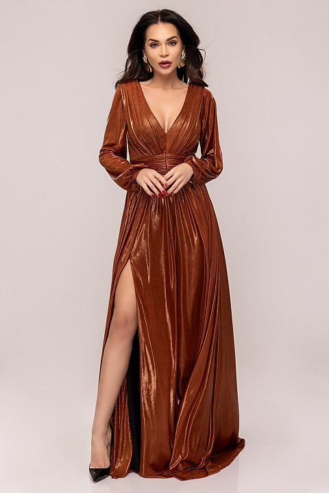 Abito lungo marrone metalizzato. Realizzato in tessuto scintillante, questo abito cattura la luce per un effetto mozzafiato. La scollatura profonda a V aggiunge un tocco sensuale, mentre le maniche lunghe e ampie donano un look sofisticato e chic. La vita stretta esalta la figura, con una gonna fluida e ampia che termina con uno spacco laterale, perfetto per un look glamour e seducente.