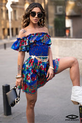 Abito corto con stampa floreale vivace su sfondo blu, caratterizzato da uno scollo a barca con balze che esalta le spalle. La vita arricciata e la cintura dorata con dettaglio a farfalla sottolineano la silhouette. Ideale per occasioni casual o passeggiate in città.