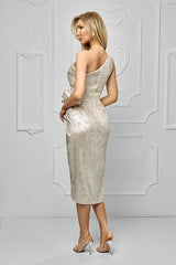 Seducente e sofisticato, questo abito dorato asimmetrico è perfetto per cerimonie e serate glamour. Il design monospalla valorizza il décolleté, mentre il tessuto laminato regala riflessi brillanti ad ogni movimento. Le maxi rose in tessuto posizionate su spalla e vita aggiungono un tocco romantico e couture. Lo spacco laterale completa il look con una nota sensuale. Ideale da indossare con sandali nude o dorati e clutch preziosa.