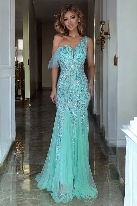 Un abito che incanta con la sua raffinata combinazione di eleganza e sensualità! Questo splendido vestito verde acqua è decorato con paillettes scintillanti che creano un effetto ondeggiato, ispirato al mare. Il corpetto monospalla con scollo a cuore è impreziosito da una leggera manica in tulle, mentre la gonna fluida esalta la silhouette con un tocco fiabesco. Perfetto per eventi esclusivi, cerimonie e serate glamour. Crea il Tuo Stile Unico e lasciati avvolgere dalla magia di questo abito!