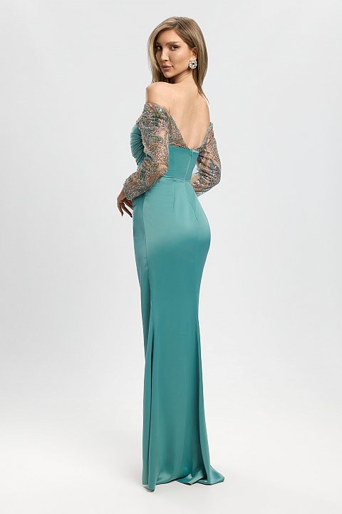 Raffinato ed esclusivo, questo abito lungo color verde acqua incanta con lo spacco laterale profondo e le maniche nude effetto tattoo, ricamate con dettagli brillanti. Il corpetto drappeggiato e lo scollo bardot valorizzano la silhouette, rendendolo la scelta perfetta per cerimonie serali, eventi glamour o serate di gala. Perfetto in abbinamento con gli Orecchini Fiore Verde Goccia per un look coordinato e scenografico.