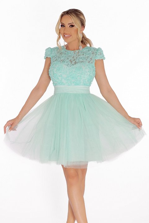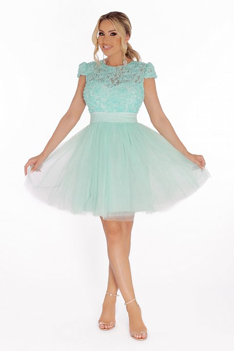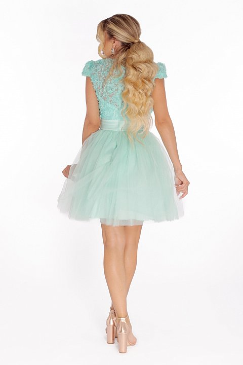 Abito princess in tulle con gonna corta dal modesto volume e corpino dalla piccole maniche ad aletta, entrambi chiusi dietro da unica zip invisibile.