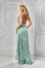 Scopri il maxi dress perfetto per le tue giornate estive: questo abito lungo a fantasia ondulata nei toni del turchese, blu e arancio regala un look fresco, vivace e femminile. Il design con scollo a V, spalline sottili e gonna asimmetrica con volant valorizza la silhouette e dona movimento ad ogni passo. Ideale per vacanze al mare, aperitivi in riva o eventi estivi eleganti. Abbinalo a sandali intrecciati e cappello a tesa larga per un outfit irresistibile.
