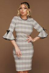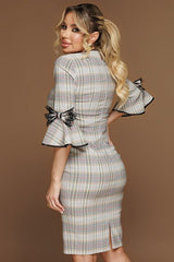 Questo abito a tubino a quadri è la scelta perfetta per chi ama uno stile classico ma con un tocco originale. Il design aderente esalta la silhouette, mentre le maniche a campana con fiocchi in pizzo donano un dettaglio raffinato e femminile. Il tessuto strutturato garantisce comfort ed eleganza, rendendolo ideale per ufficio, eventi o occasioni speciali.