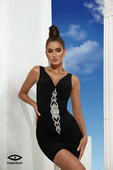 Tubino elegante con spalline e coulisse. Balza all'occhio per il ragguardevole dettaglio decorativo in strass verticale.