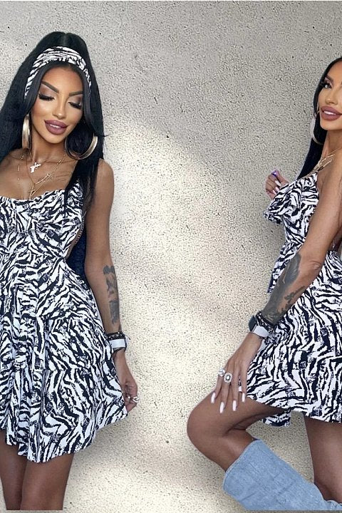 Abito corto animalier con balze e cut out, fascia per capelli inclusa.