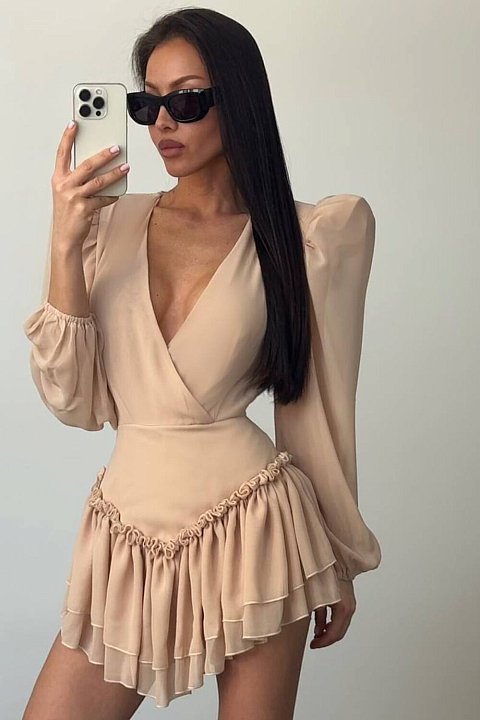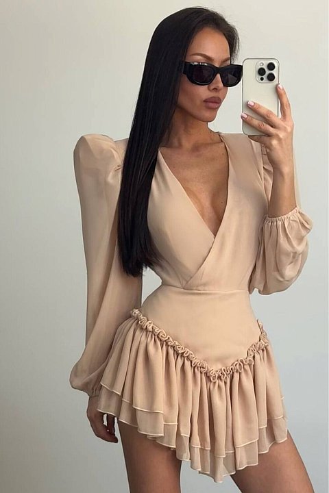 Eleganza e sensualità si fondono in questo abito corto color cappuccino, perfetto per un look sofisticato e femminile. Il profondo scollo a V esalta il décolleté, mentre le maniche lunghe a sbuffo donano un tocco di classe. La gonna asimmetrica con balze arricciate aggiunge movimento e originalità, rendendolo ideale per serate speciali o eventi glamour. Abbinalo a tacchi alti e accessori dorati per un outfit irresistibile.