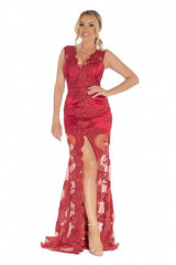 Abito da cerimonia rosso in tulle ricamato. Lungo tubino smanicato, elegante e aderente, con trasparenze e coperture sulla zona seno e fianchi, con raso in tinta. Scollatura a V e spacco frontale, rifiniti con elegante pizzo smerlato.