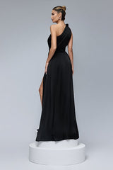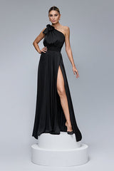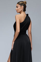 Abito lungo elegante con spacco, caratterizzato da un bustier monospalla accessoriato con fiocco.