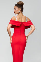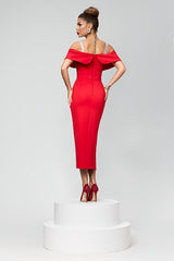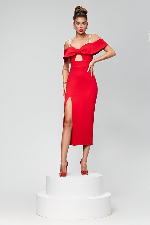 Abito Midi Rosso Elegante con Fiocco e Spalline Scintillanti