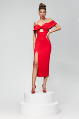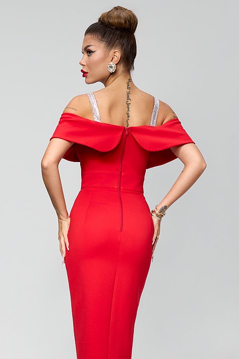 Scopri il fascino di questo abito midi rosso con un sofisticato fiocco frontale, spacco laterale e spalline decorate scintillanti. Perfetto per serate eleganti e occasioni speciali, offre uno stile senza tempo con un tocco moderno.