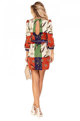 Abito casual in raso con fascia annodabile, maniche 3/4 con spalline a sbuffo e schiena parzialmente scoperta.