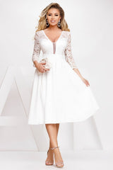 Abito midi elegante di colore bianco. Gonna in cady a pieghe e fondo dalla lunghezza oltre il ginocchio. Corpino sagomato, debitamente foderato, con scollo a V e maniche 7/8 lasciate nella naturale trasparenza del pizzo.