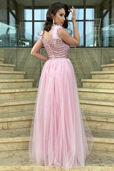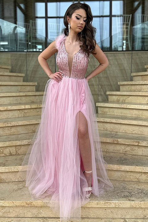 Abito lungo da sera rosa con corpetto decorato da paillettes e piume, gonna in tulle vaporoso e spacco laterale. Un look romantico e sofisticato, perfetto per cerimonie ed eventi eleganti.