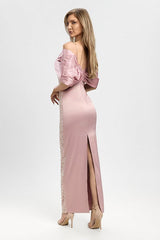 Romantico e sofisticato, questo abito lungo rosa è una scelta impeccabile per cerimonie e serate eleganti. Il corpetto ricamato con perline e paillettes cattura la luce con delicatezza, mentre il maxi fiocco drappeggiato sulle spalle aggiunge un tocco di femminilità e raffinatezza. La linea aderente esalta la figura con grazia, rendendolo ideale per matrimoni, gala o eventi da sogno.