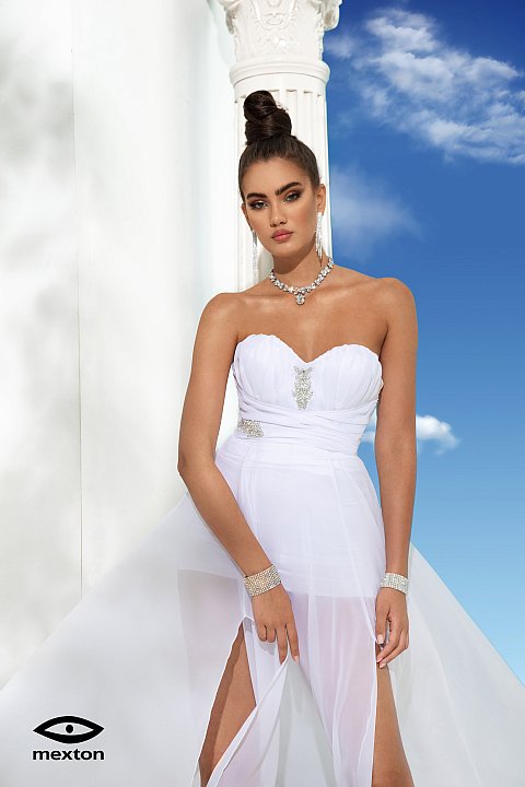 Abito lungo elegante in organza con doppio spacco e corpetto a cuore pieghettato, dettaglio in paillettes al centro del bustier.