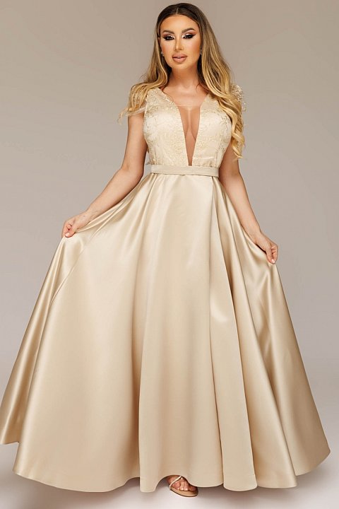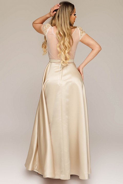 Raffinato e sensuale, questo abito lungo beige è la scelta perfetta per cerimonie ed eventi importanti. Il bustino in pizzo con scollo a V profondo valorizza il décolleté, mentre le maniche corte in tulle donano un tocco romantico. La gonna fluida in tessuto satinato presenta un ampio spacco laterale che slancia la figura e aggiunge un tocco di femminilità audace. Ideale per matrimoni, gala o serate speciali, questo abito unisce eleganza e seduzione con uno stile senza tempo.