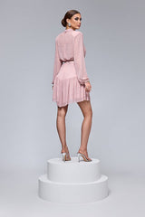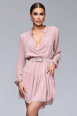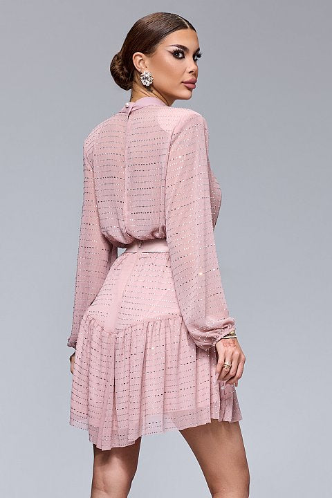 Elegante mini abito rosa con scollo a V profondo è perfetto per un look sofisticato e femminile. Realizzato in un tessuto leggero e fluido, presenta un delicato motivo a righe orizzontali con dettagli luccicanti che donano un tocco di glamour. Le maniche lunghe a sbuffo aggiungono volume e movimento, mentre la cintura con fibbia gioiello in vita esalta la silhouette, creando un effetto avvolgente.