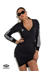 Abito sportivo a maniche lunghe con strisce bianche a contrasto, scollo a V incrociato, elastico in vita e tasca tono su tono con patta sul fianco.