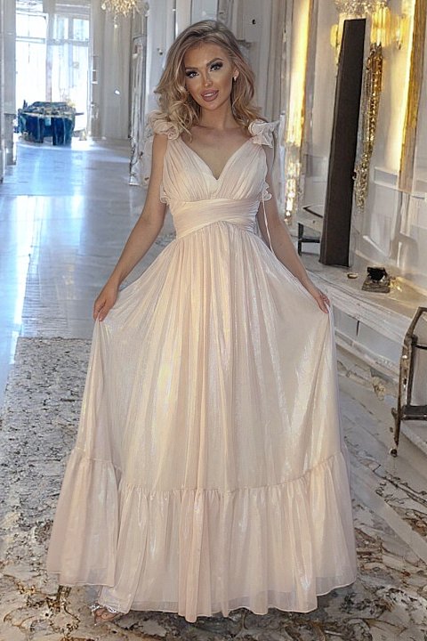 Elegante abito lungo nude con dettagli arricciati e scollo a V, perfetto per occasioni speciali. Il tessuto brillante e la schiena scoperta aggiungono un tocco sofisticato e romantico.
