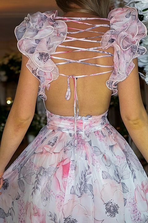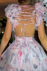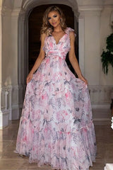 Abito lungo rosa con stampa floreale, ideale per matrimoni ed eventi speciali. Caratterizzato da scollo a V, maniche arricciate e schiena scoperta, è perfetto per un look romantico e sofisticato.
