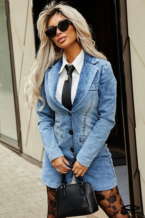 Abito in jeans a maniche lunghe con bottoni neri a contrasto sul davanti, ha un colletto a revers e delle tasche a filetto.