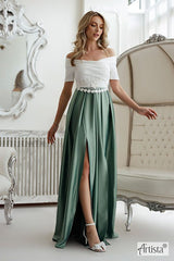 Questo abito bicolore è delicato e romantico, con il corpetto bianco e la gonna lunga verde con spacco frontale. È perfetto per un evento elegante o una cerimonia, con uno stile sofisticato ma leggero.
