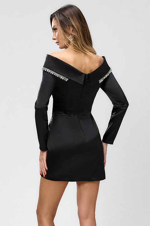 Perfetto per serate chic e occasioni speciali, questo tubino nero è un mix di raffinatezza e stile audace. Il rever in satin è impreziosito da una cascata di strass scintillanti, mentre la cintura in raso annodata in vita definisce la silhouette con un tocco di femminilità. Le maniche a 3/4 con dettagli luminosi sulle estremità aggiungono classe ed esclusività. Indossalo con tacchi alti e accessori preziosi per un outfit da vera protagonista.