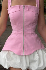 Questo abito due pezzi unisce carattere e femminilità: un top beige strutturato con zip frontale e spalline larghe che definisce il busto, abbinato a una mini gonna bianca a palloncino dal volume originale. Un design moderno e deciso, ideale per chi cerca un look glamour e cittadino. Perfetto per aperitivi, eventi estivi o un outfit da fashion icon.