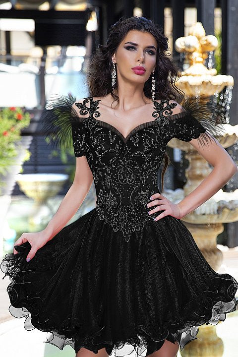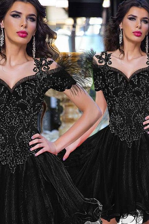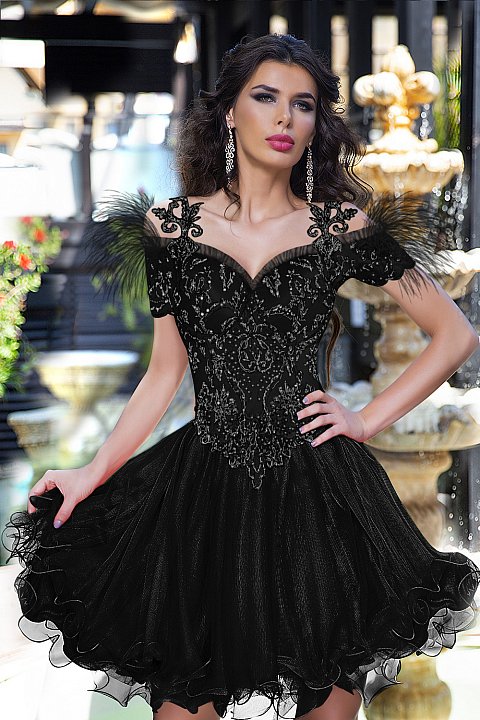 Abito princess di colore nero con corpino ricamato. Gonna voluminosa in organza con orlo ondulato e bustier a maniche corte e ampia scollatura a cuore con spalline in passamaneria intagliata.