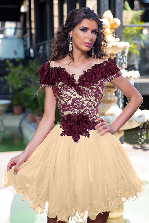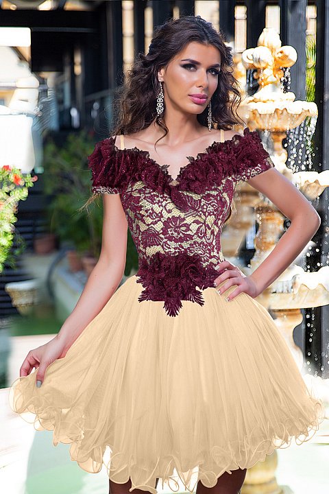 Abito princess in organza beige e pizzo color violetto Gonna voluminosa a campana dal fondo ondulato e corpino sagomato con scollatura aperta intorno alle spalle. Passamaneria floreale e tridimensionale, posta a rifinire ed impreziosire il dècolletè e il punto vita.