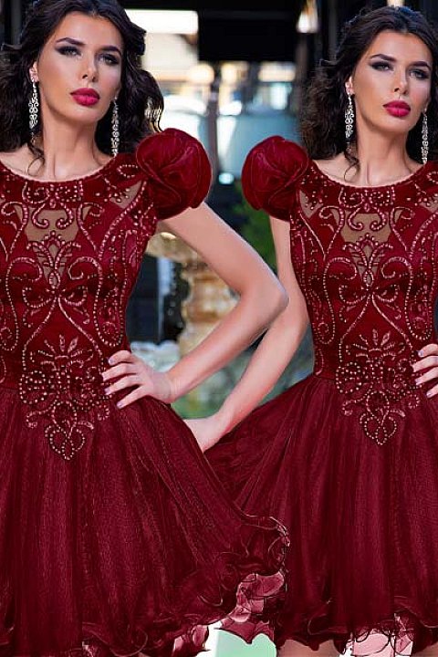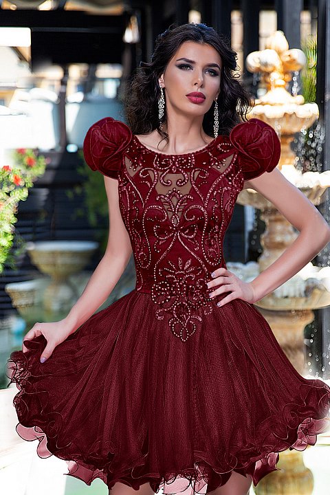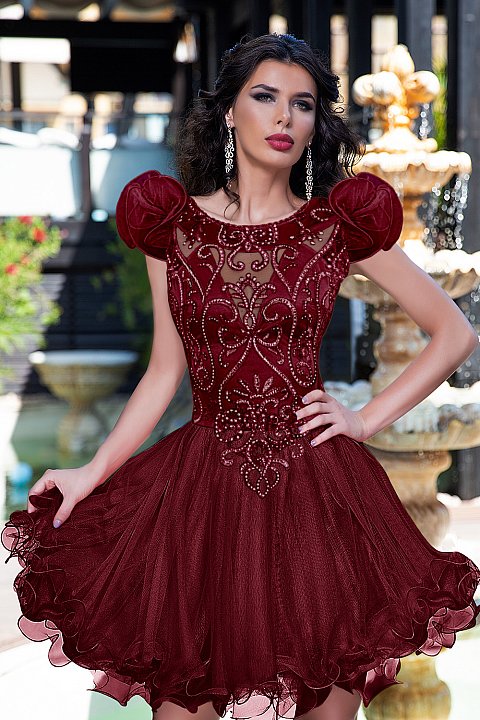 Abito princess in organza di colore bordeaux con ricami su tono. Corpino a bustier con scollo a barchetta interamente impreziosito da passamaneria a rilievo e giromanica bordato da rouches. Gonna voluminosa a scampanata con orlo ondulato.
