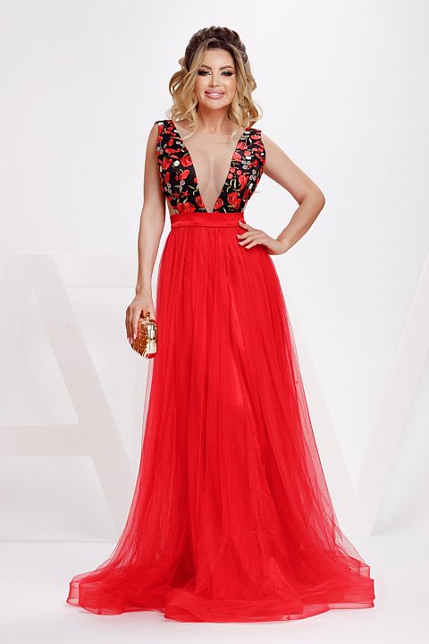 Abito stile princess con fantasia floreale su sfondo nero sul bustier. Corpetto dal profondo scollo a V e schiena scoperta. Gonna in tulle rossa.