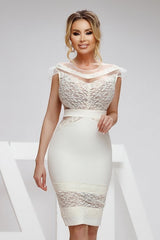 Abito tre quarti beige con inserti in pizzo trasparente. L'abito è alla base del collo ma la trasparenza del tulle lo trasforma in un abito estremamente femminile.