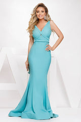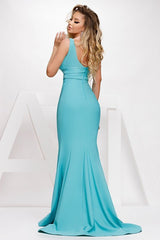 Abito elegante a sirena di colore azzurro. Linea sinuosa con incrocio sul dècolletè e lunga gonna fasciante dalla pronunciata svasatura sul fondo.