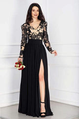 Abito lungo elegante a maniche lunghe in pizzo, con spacco e corpetto bicolore.