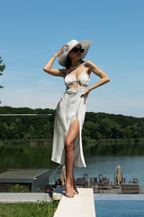 Abito midi casual e semi elegante con spacco e bikini. Ricami traforati sul corpetto con cut out.