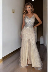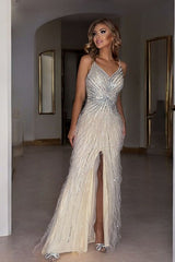 Scopri l'eleganza senza tempo con questo abito da sera a sirena in tonalità champagne. Decorato con paillettes scintillanti e frange delicate, questo vestito esalta la silhouette e aggiunge un tocco di lusso al tuo look. La scollatura a cuore, le spalline sottili e lo spacco frontale conferiscono raffinatezza e sensualità, rendendolo perfetto per eventi esclusivi, matrimoni e serate di gala. Realizzato con materiali di alta qualità, questo abito offre un equilibrio perfetto tra stile e comfort.
